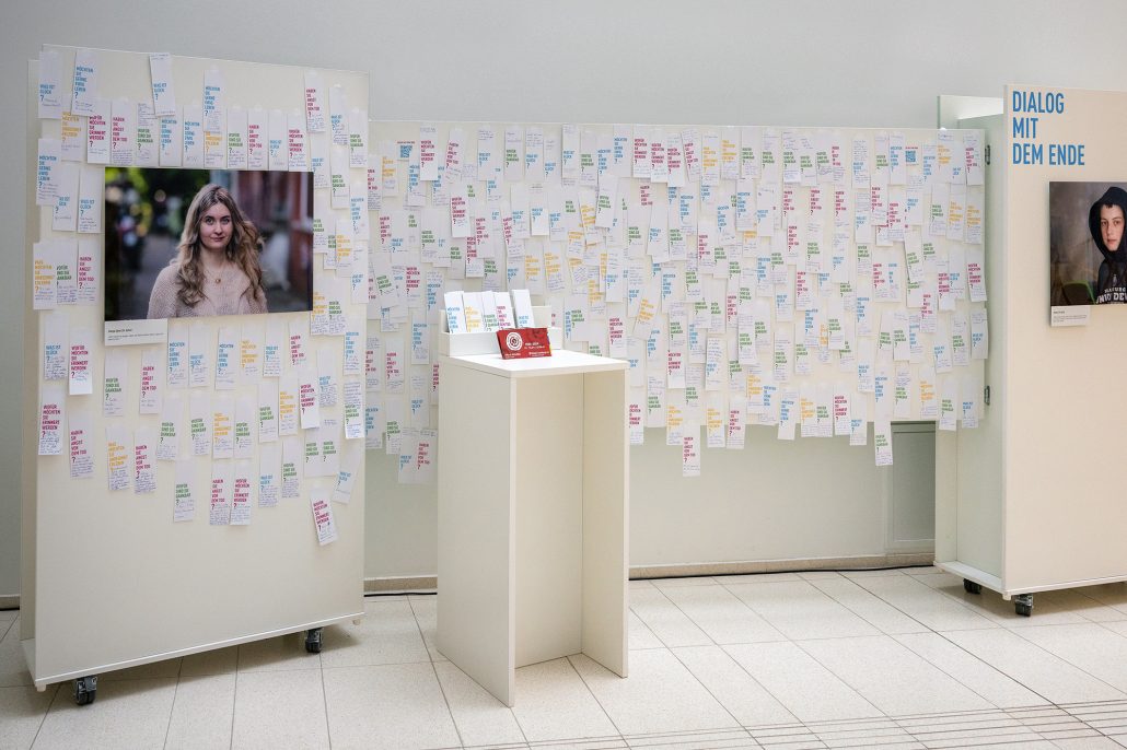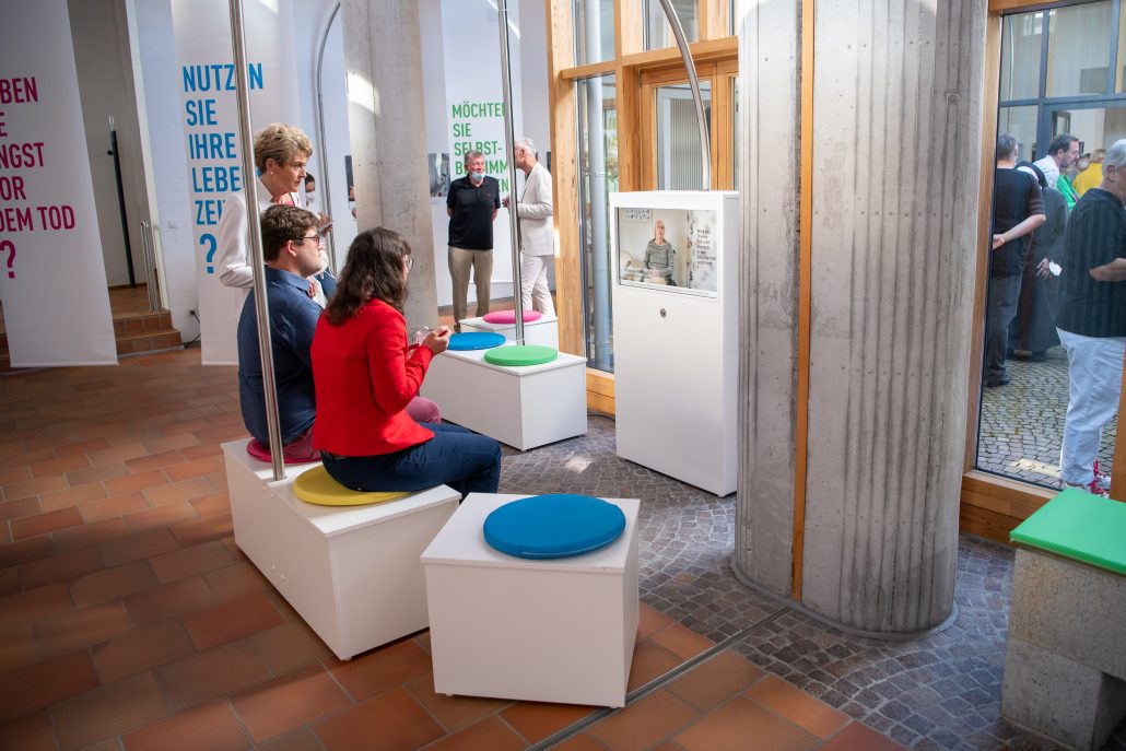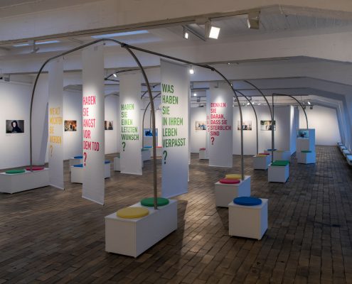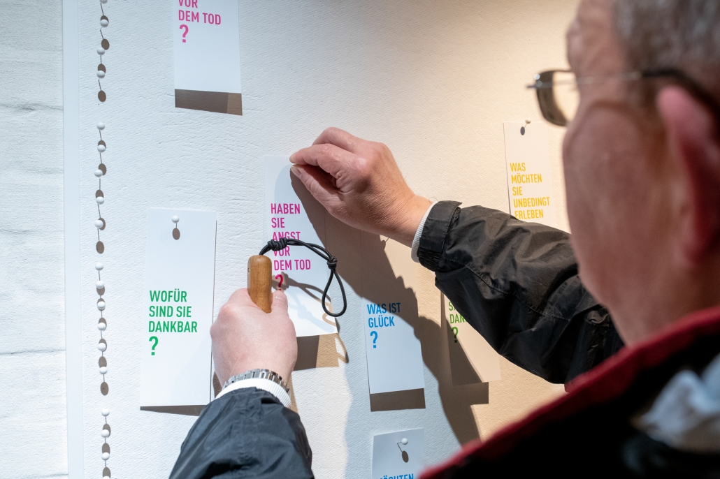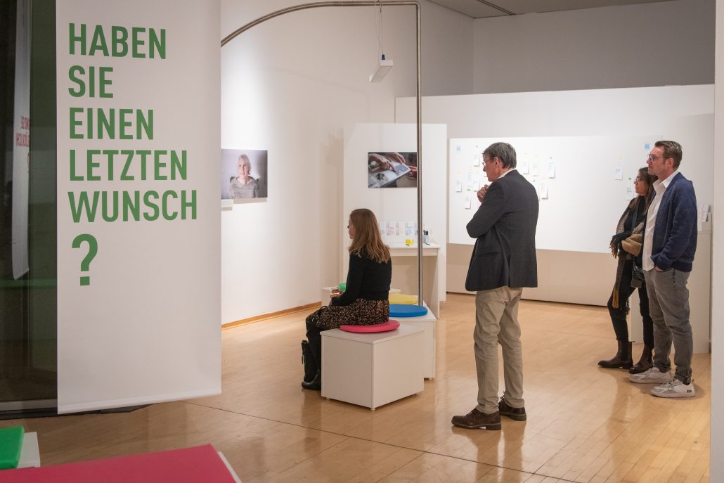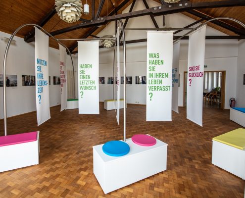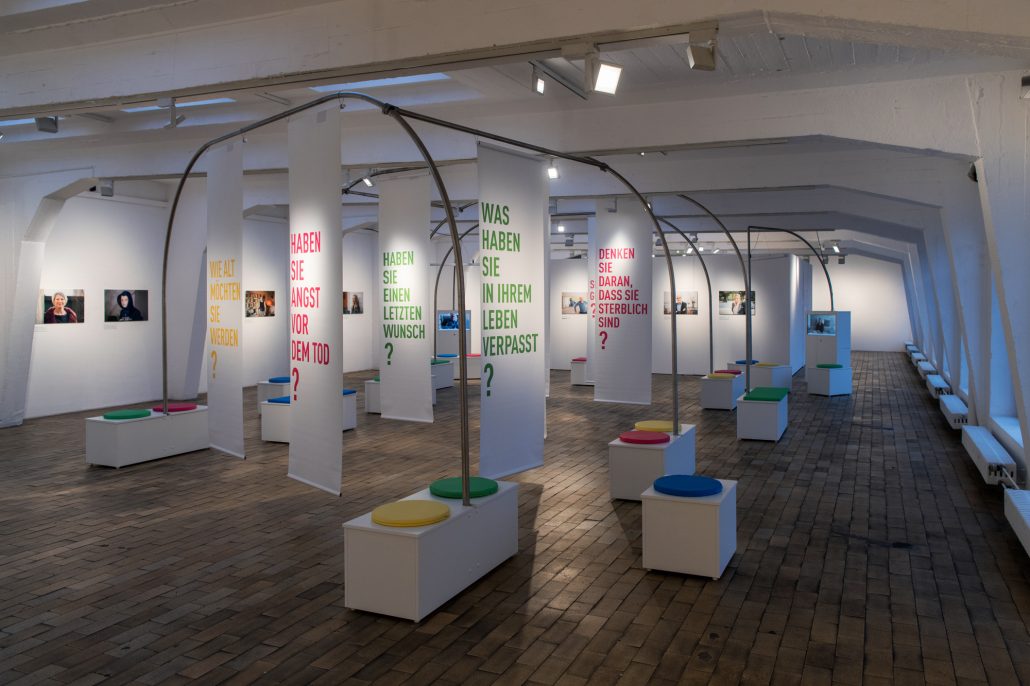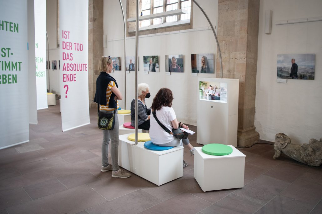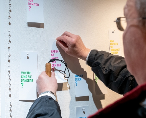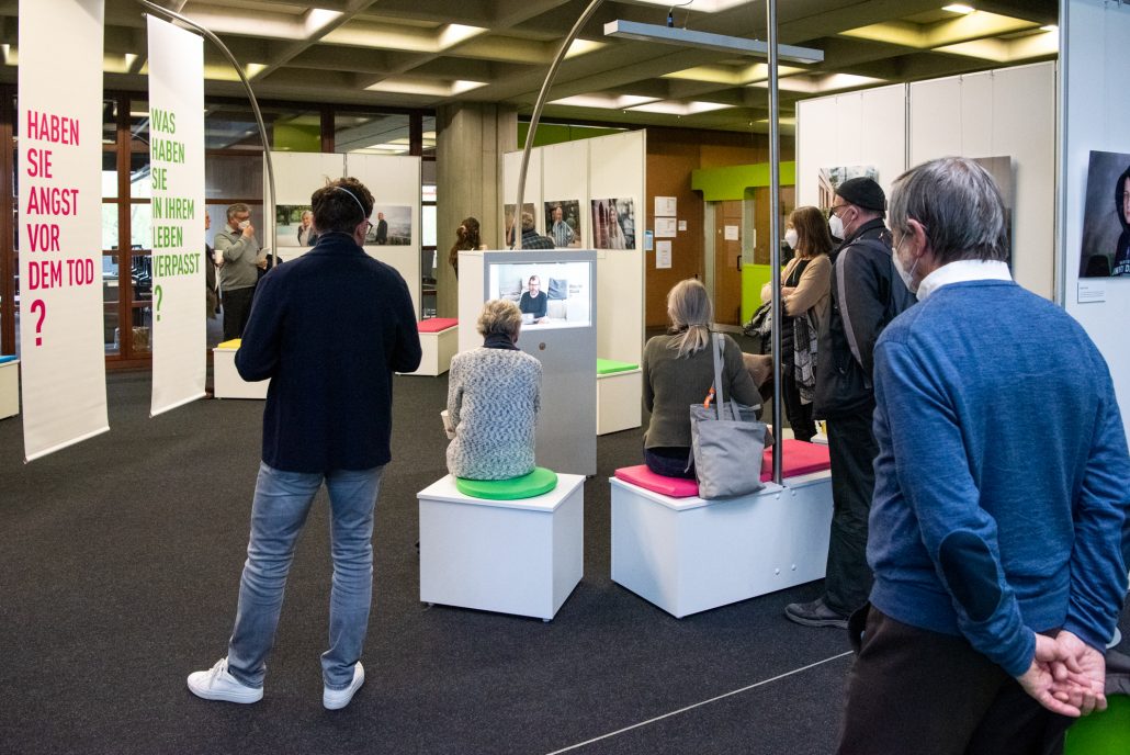 In Anwesenheit des Trierer Oberbürgermeisters Wolfram Leibe wurde die Wanderausstellung am 7. Januar 2022 in der Tuchfabrik Trier eröffnet. Allein in den ersten drei Wochen begrüßte die Ausstellung knapp 600 Besucher:innen. Nach der langen coronabedingten Verzögerung war der Auftakt ein großer Erfolg: Dialog mit dem Ende konnte in den weitläufigen Ausstellungsräumen der Tuchfabrik ganz besonders wirken – und hat einen Nerv getroffen, wovon auch die vielen sehr persönlichen Geschichten zeugten, die die Besucher:innen teilten.
