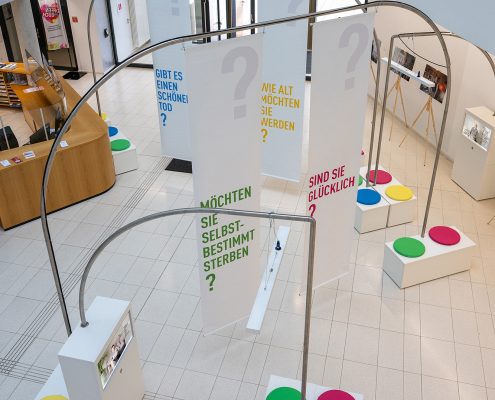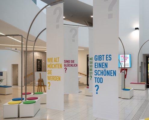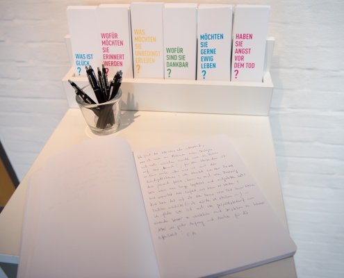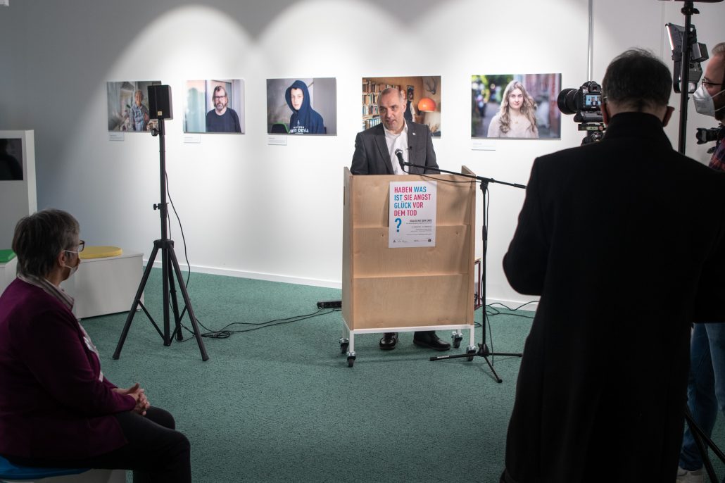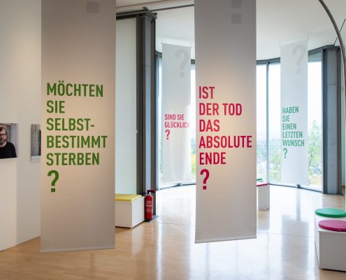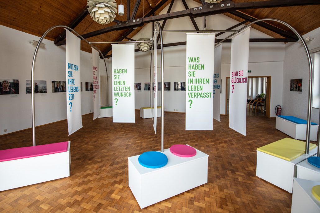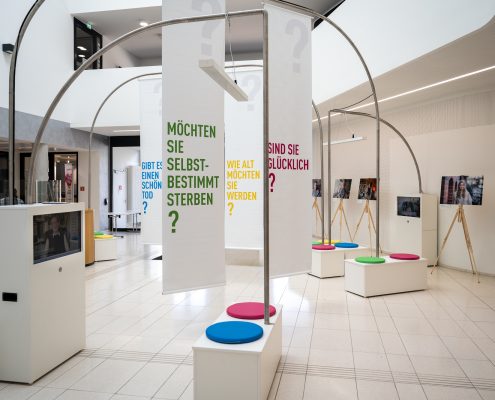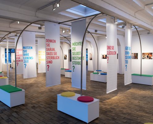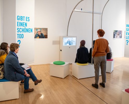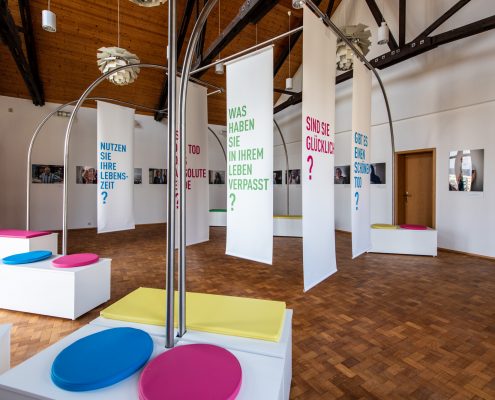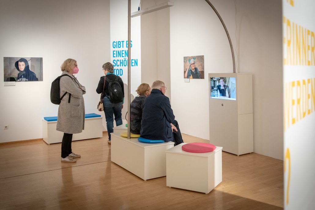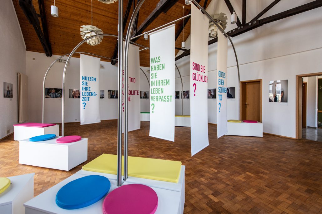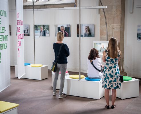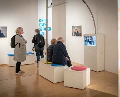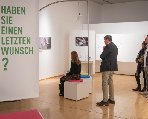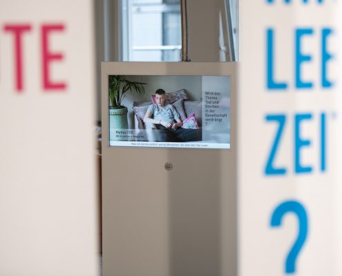 In Anwesenheit des Trierer Oberbürgermeisters Wolfram Leibe wurde die Wanderausstellung am 7. Januar 2022 in der Tuchfabrik Trier eröffnet. Allein in den ersten drei Wochen begrüßte die Ausstellung knapp 600 Besucher:innen. Nach der langen coronabedingten Verzögerung war der Auftakt ein großer Erfolg: Dialog mit dem Ende konnte in den weitläufigen Ausstellungsräumen der Tuchfabrik ganz besonders wirken – und hat einen Nerv getroffen, wovon auch die vielen sehr persönlichen Geschichten zeugten, die die Besucher:innen teilten.