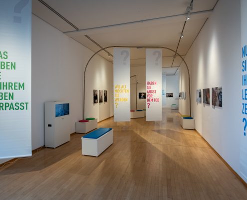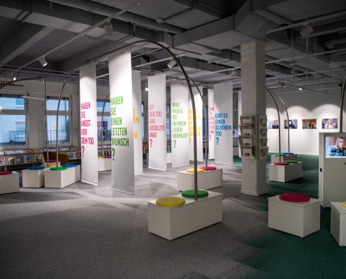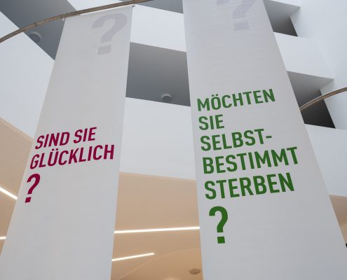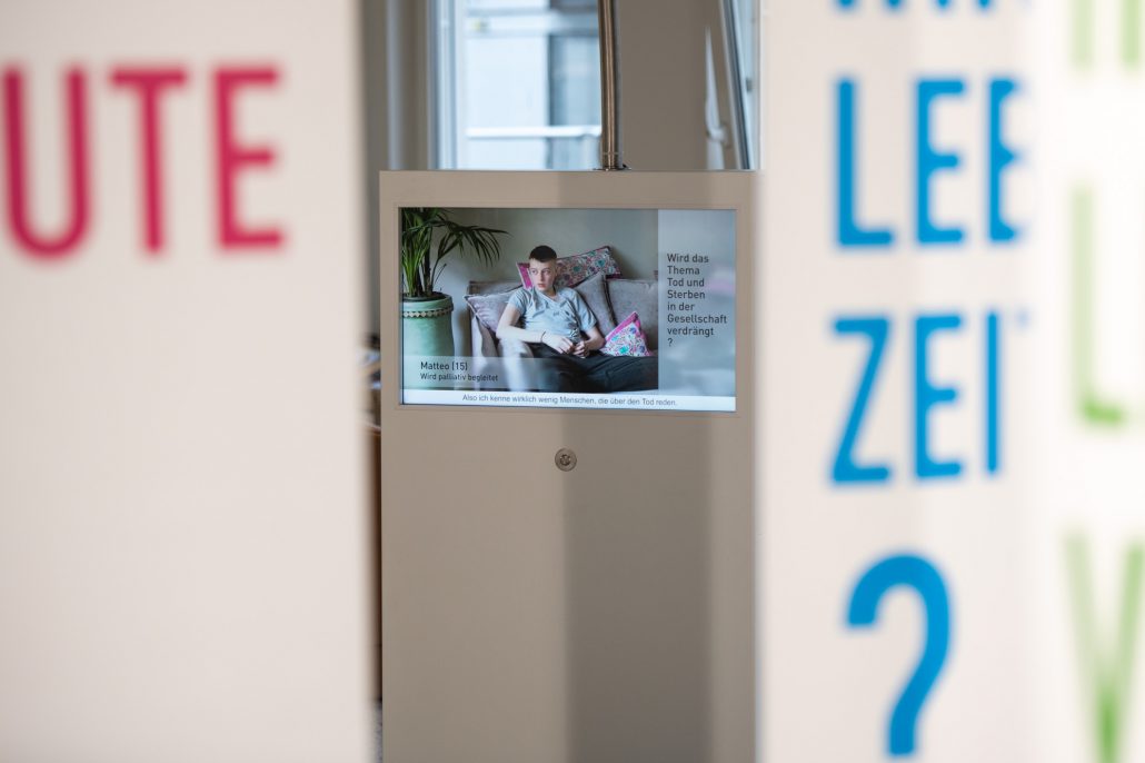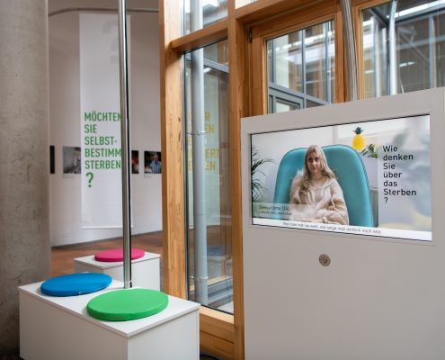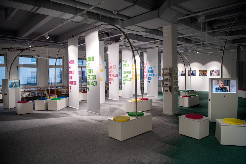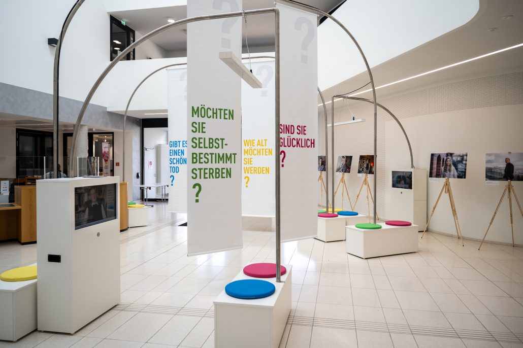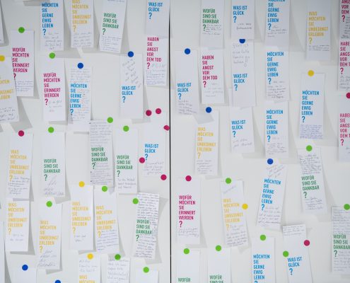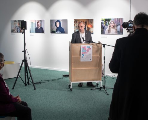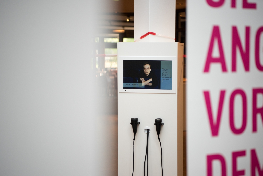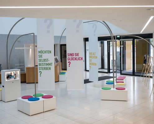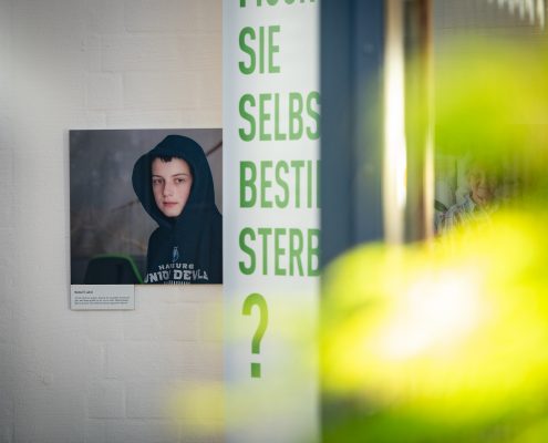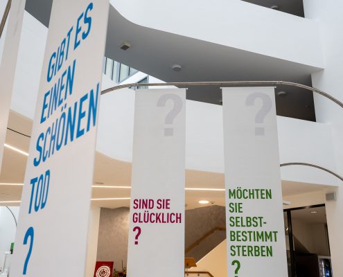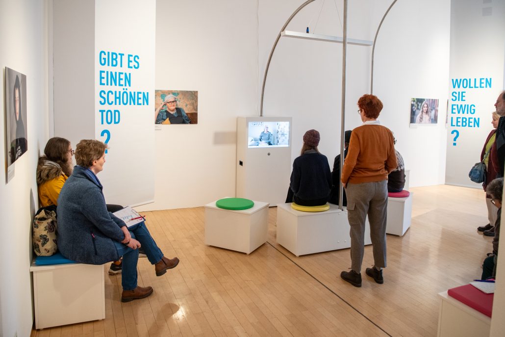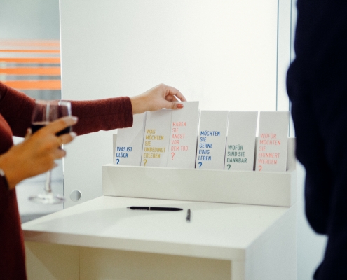 In Anwesenheit des Trierer Oberbürgermeisters Wolfram Leibe wurde die Wanderausstellung am 7. Januar 2022 in der Tuchfabrik Trier eröffnet. Allein in den ersten drei Wochen begrüßte die Ausstellung knapp 600 Besucher:innen. Nach der langen coronabedingten Verzögerung war der Auftakt ein großer Erfolg: Dialog mit dem Ende konnte in den weitläufigen Ausstellungsräumen der Tuchfabrik ganz besonders wirken – und hat einen Nerv getroffen, wovon auch die vielen sehr persönlichen Geschichten zeugten, die die Besucher:innen teilten.