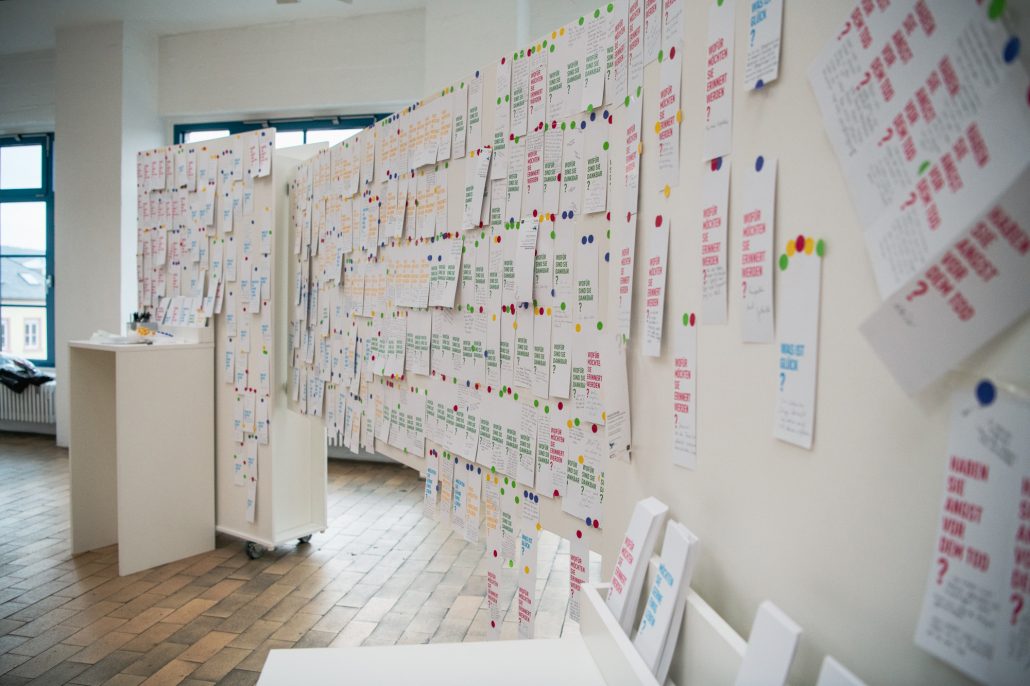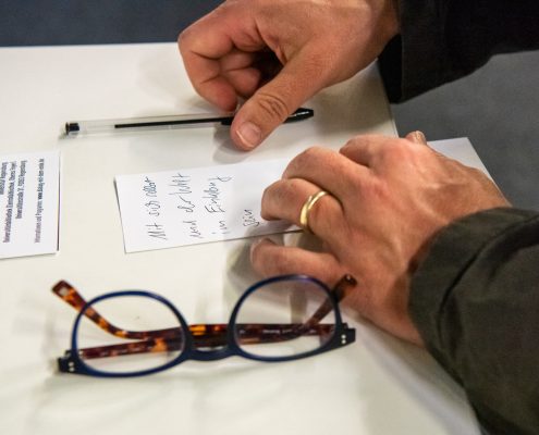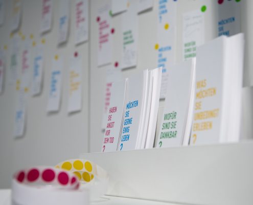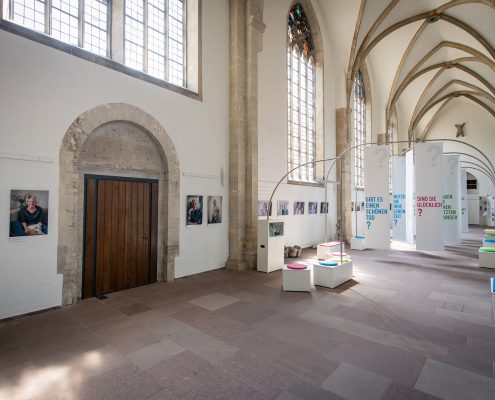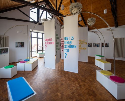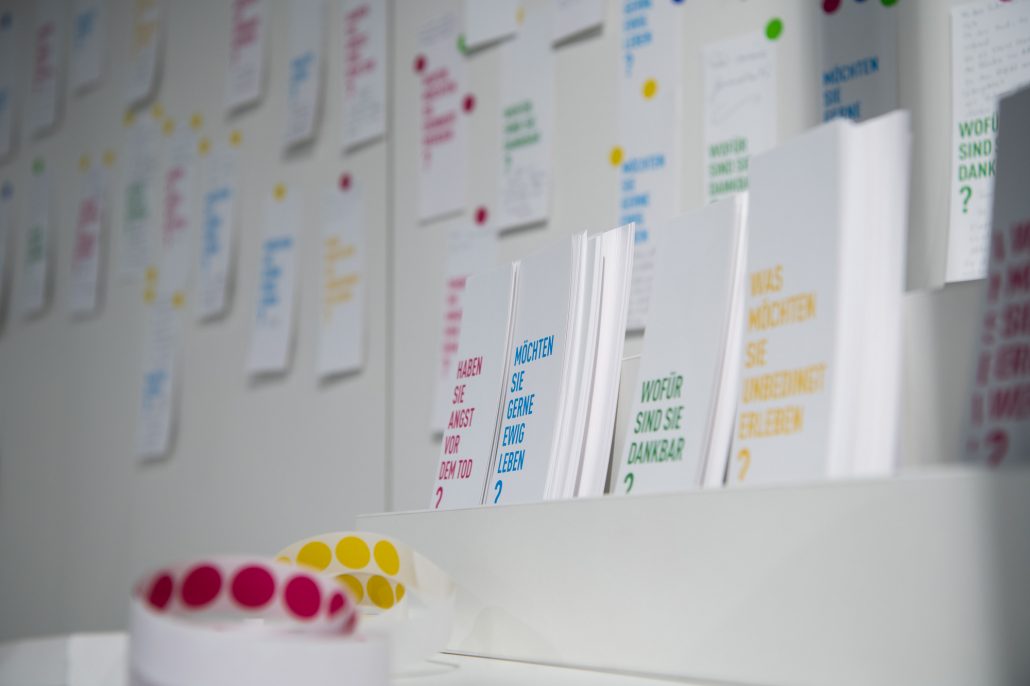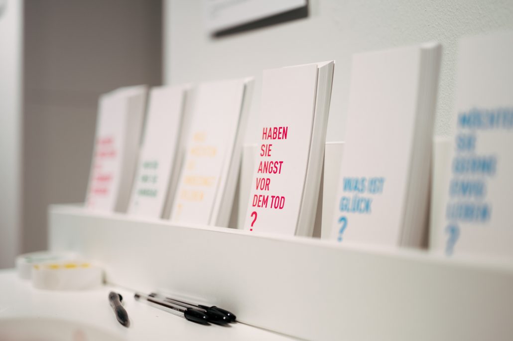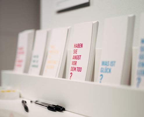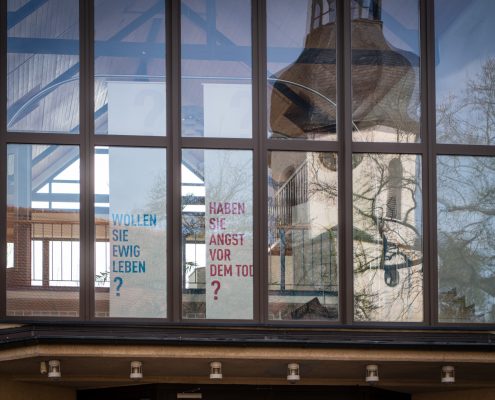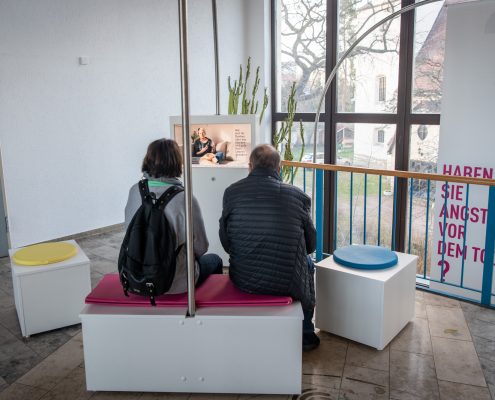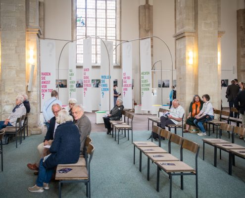 170 Fragekarten haben die Besucher:innen von Dialog mit dem Ende im Gemeindezentrum Kirchspiel Halle Süd ausgefüllt. Vom 2. März bis 18. April gastierte die Wanderausstellung in der Gemeinde, wo sie nicht nur durch das Rahmenprogramm in das kulturelle Leben der Stadt, sondern auch eng in die Gemeindearbeit eingebunden wurde. In der familiären Umgebung bot sich viel Gelegenheit für ausgiebige Diskussionen, vor allem mit Schulklassen sowie Konfirmand:innengruppen, die sich vorsichtig und mit einfühlsamer Begleitung an die Themen Tod und Sterben heranwagten. Gemütlich und behutsam ging es auch in der Wohnzimmerkirche zu, wo Johanna Klug aus ihrem Buch „Mehr vom Leben“ las und zum Gespräch einlud.