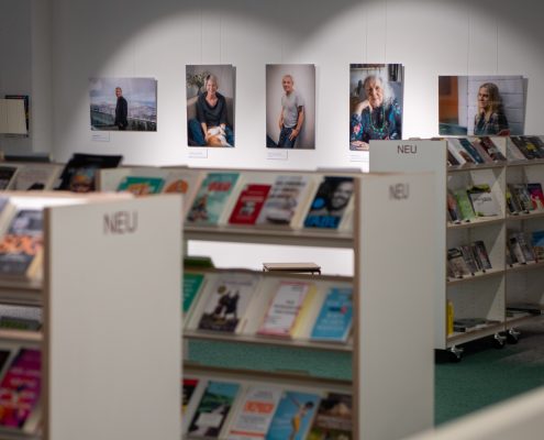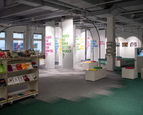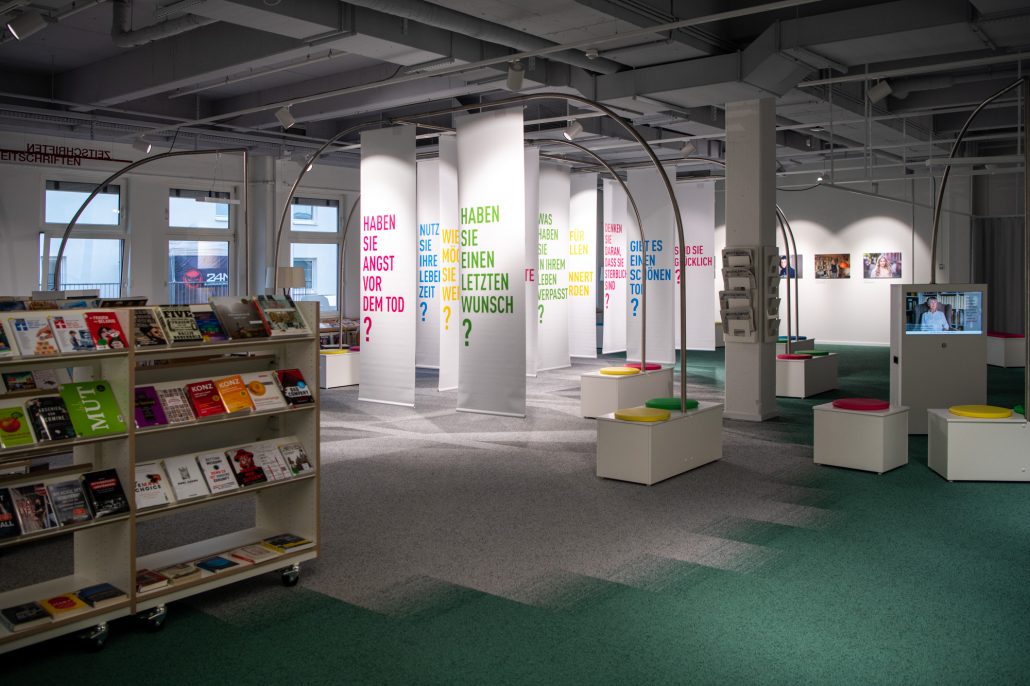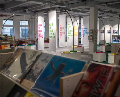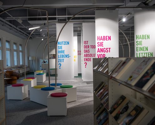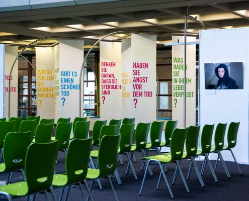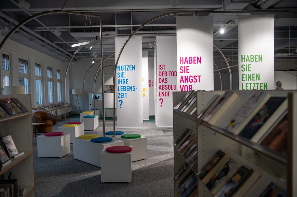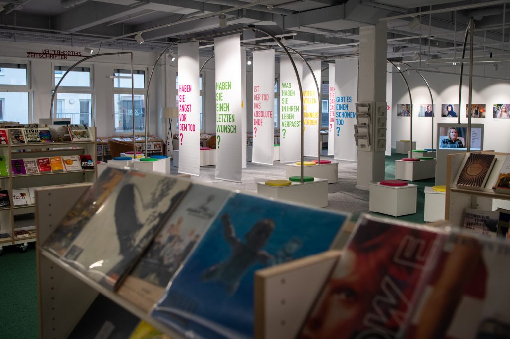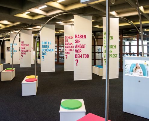 Zweite Station der Wanderausstellung war die Stadtbibliothek in Arnsberg-Neheim, wo Bürgermeister Ralf Paul Bittner die Ausstellung aufgrund regionaler Corona-Beschränkungen in kleinem Kreis eröffnete. Durch die Einbettung im öffentlichen Raum der Bibliothek gestaltete sich in den folgenden Ausstellungswochen eine offene Atmosphäre zwischen den Besucher:innen der Stadtbibliothek und den Ausstellungsgästen. Auch die vielfältigen Veranstaltungen im Rahmenprogramm wurden durch neue Begegnungsräume und außergewöhnliche Zugänge zum Thema Tod und Sterben geprägt. Ein besonderes Highlight war die Friedhofsführung mit Friedhofsflüsterin, bei der Interessierte in mystischer Atmosphäre historische Bräuche und Rituale kennenlernen konnten.