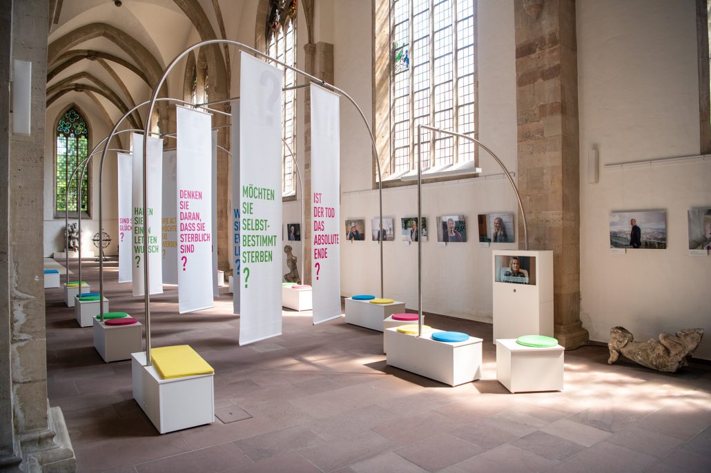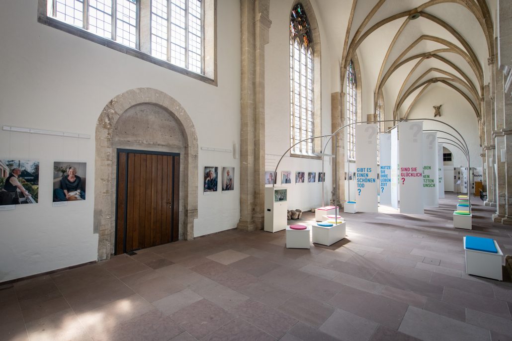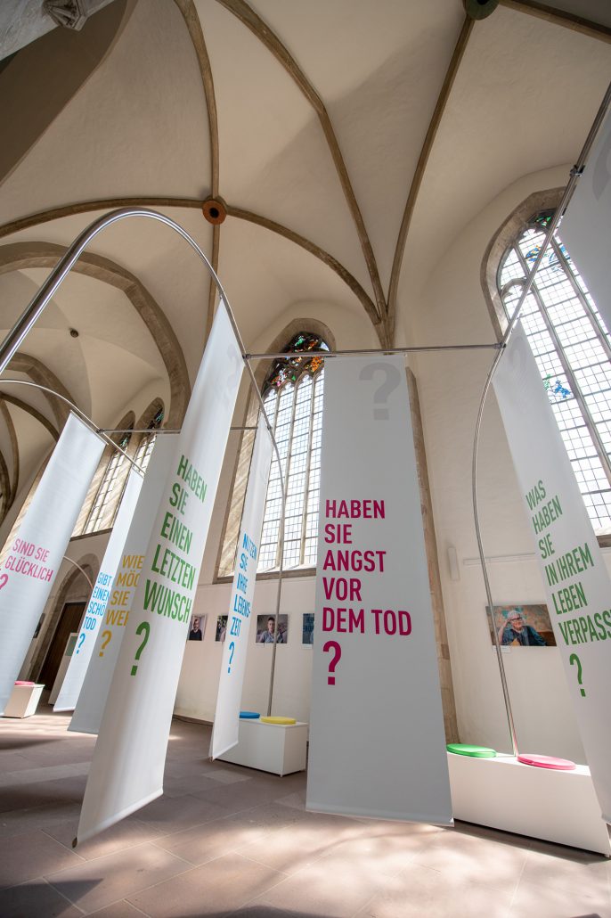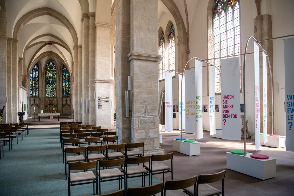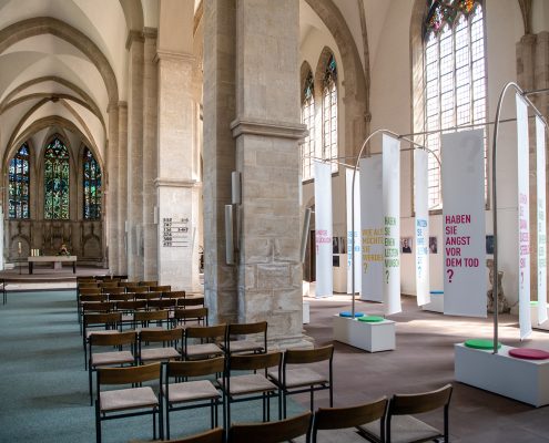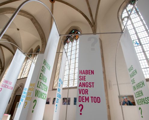 Die fünfte Station der Ausstellung Dialog mit dem Ende war die St. Andreas Kirche in Braunschweig. Unter dem höchsten Turm der Stadt waren wir bis zum 30. Juni zu Gast. In den hellen, hohen Räumen der Kirche konnten unsere Banner noch einmal in ihrer vollen Größe wirken. Um Perspektiven ging es aber nicht nur baulich und beim Ausblick über die Stadt. Auch im Gespräch mit den Vermittler:innen wurden neue Blickwinkel gefunden und bei den Veranstaltungen des Rahmenprogramms gefestigt und umgesetzt: ob mit Gesang, beim Lauschen der Lesungen und Vorträge oder beim Kunst Workshop – das Thema Leben und Tod wurde von allen Seiten durchleuchtet.